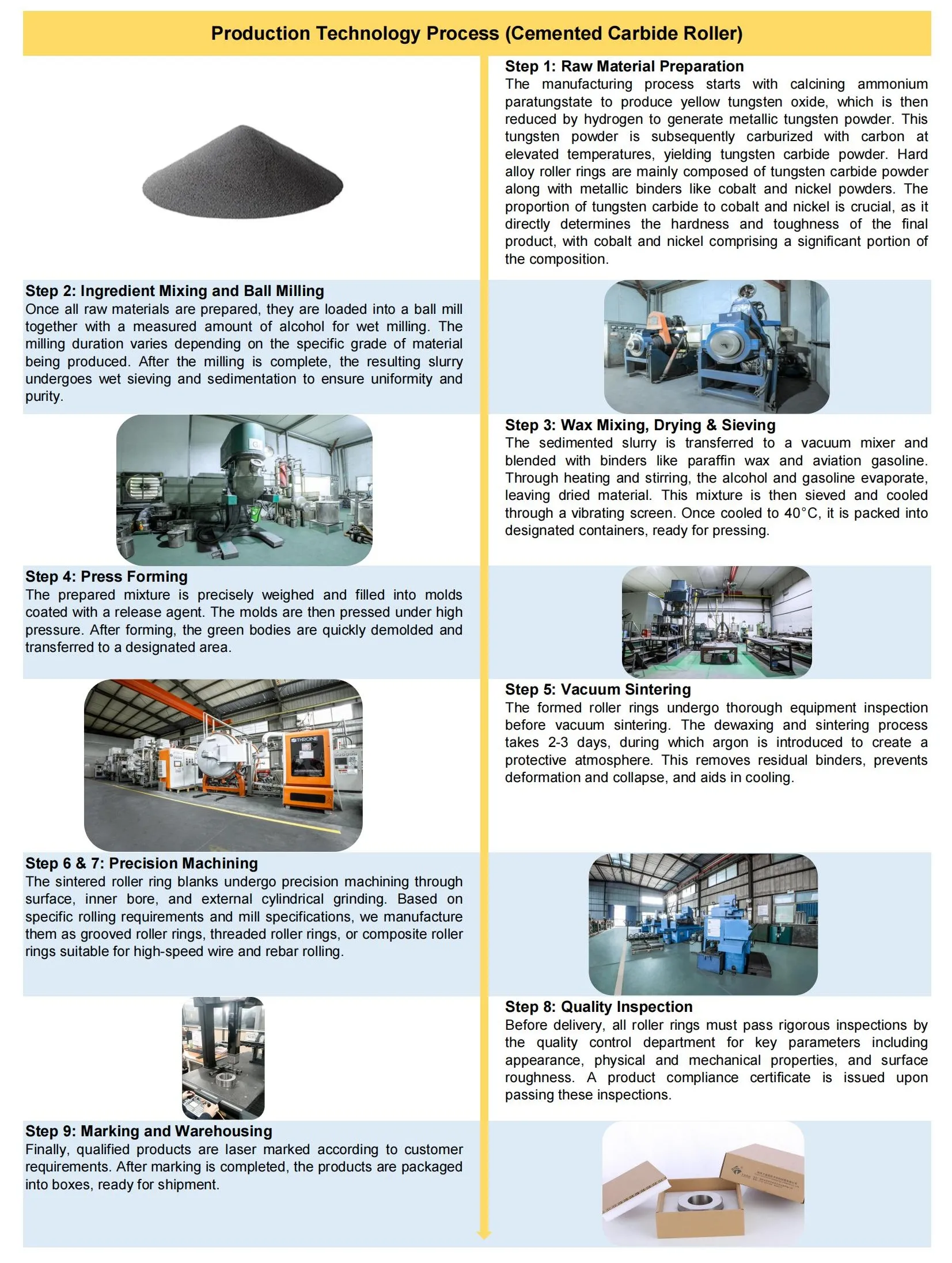 Inelele de rolă din carbură de ciment (cunoscute și sub denumirea de inele din carbură de tungsten) oferă o conductivitate termică excelentă și depășesc rolele din fontă și oțel de mare viteză de prima generație în ceea ce privește rezistența la căldură, rezistența la uzură și rezistența, cu o reducere minimă a durității la temperaturi ridicate. Dezvoltate împreună cu morile de sârmă de mare viteză, acestea sunt acum aplicate pe scară largă în standurile de finisare pentru fabricarea de sârmă de mare viteză, bare de armare și bare de oțel deformate.